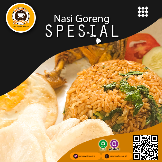 Nasi Goreng Spesial Warung Yok Ngopi dibuat dengan racikan bumbu terbaik tanpa MSG, dengan varian isi berupa ayam, telur kerupuk dan potongan timun, membuat cita rasa yang berbeda pastinya.